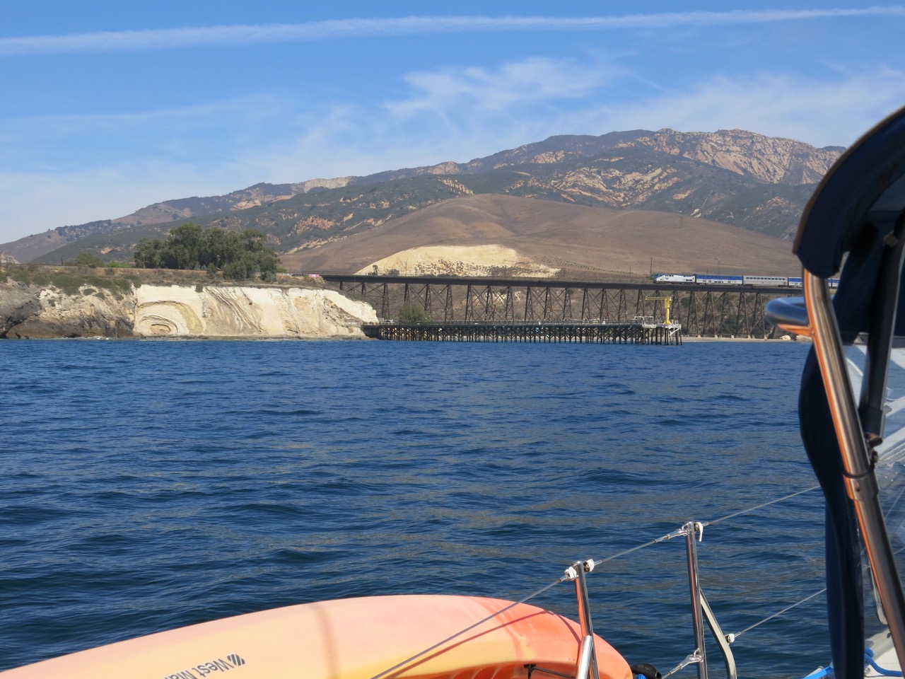 If you’re sailing west you’ll spot Gaviota pass where the 101 hooks north. Just beyond that you’ll see the railroad overpass and just below that the 400’+ pier.