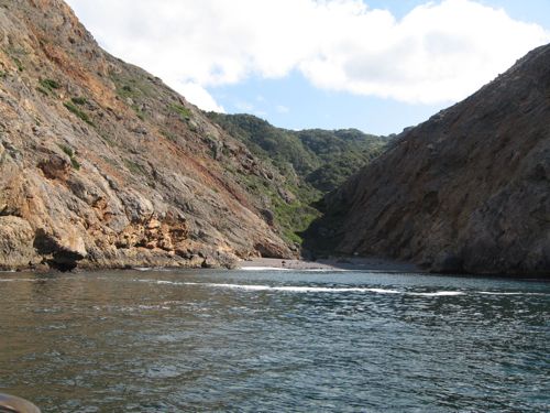 This anchorage isn’t particularly popular because it looks a bit daunting and, to some, claustrophobic. It is a fairly tight fit and suitable for no more than one 40 ft. boat. Additionally, the wind can shift from a strong canyon breeze to an onshore in short order. That turned out to be quite dangerous on our last visit as the shift happened as we were retrieving our stern anchor, which was 50′ or so from shore.