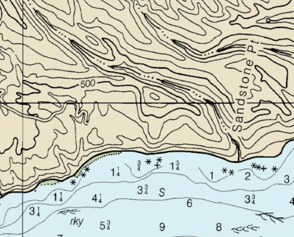 The aforementioned kelp, and where there is kelp, there are rocks. And the chart denotes a “rky” bottom.