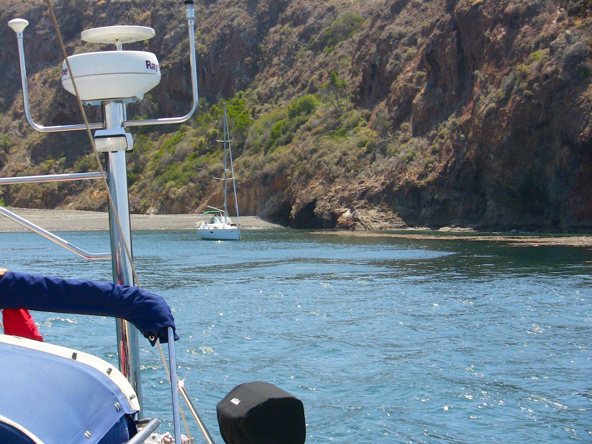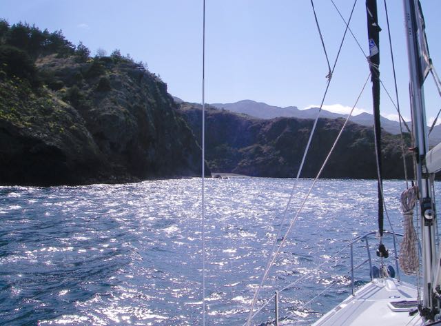 If you’re cruising the north coast going either east or west, you’ll readily spot the arch that marks the end of the protecting peninsula that forms the west wall of the main anchorage. Click thumbnail #6 near the bottom. If you’re heading in there near sunset, it can be hard to see. We cross check the GPS and chart plotter and stand off until we have the spot in sight.