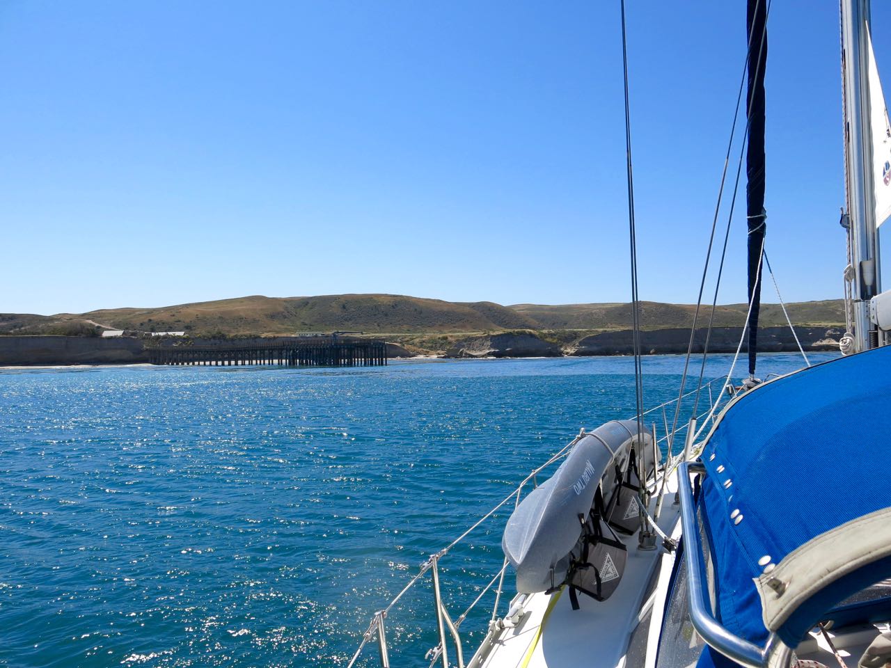 The shoreline near the anchorage is unremarkable. What you’re looking for is the pier, but that blends in with the cliffs and may not be visible until you’re within a mile or two. Even on a severe-clear day it’s frequently hard to pick out the pier. The pic at top makes that point pretty well. We frequently spot the ranch buildings first because of their reflective roofs or the windsock on the dirt runway south of the pier.